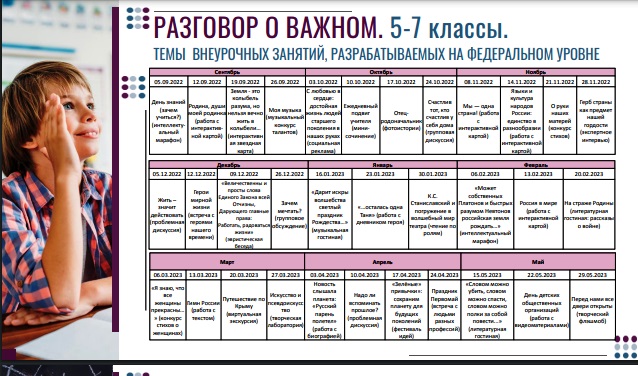 Во всех школах страны учебная неделя будет начинаться с классного часа «Разговор о важном», посвященного самым различным темам, волнующим современных ребят. Центральными темами «Разговоров о важном» станут патриотизм и гражданское воспитание, историческое просвещение, нравственность, экология и др.